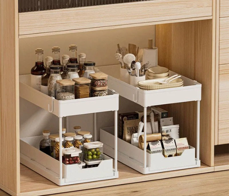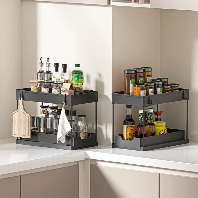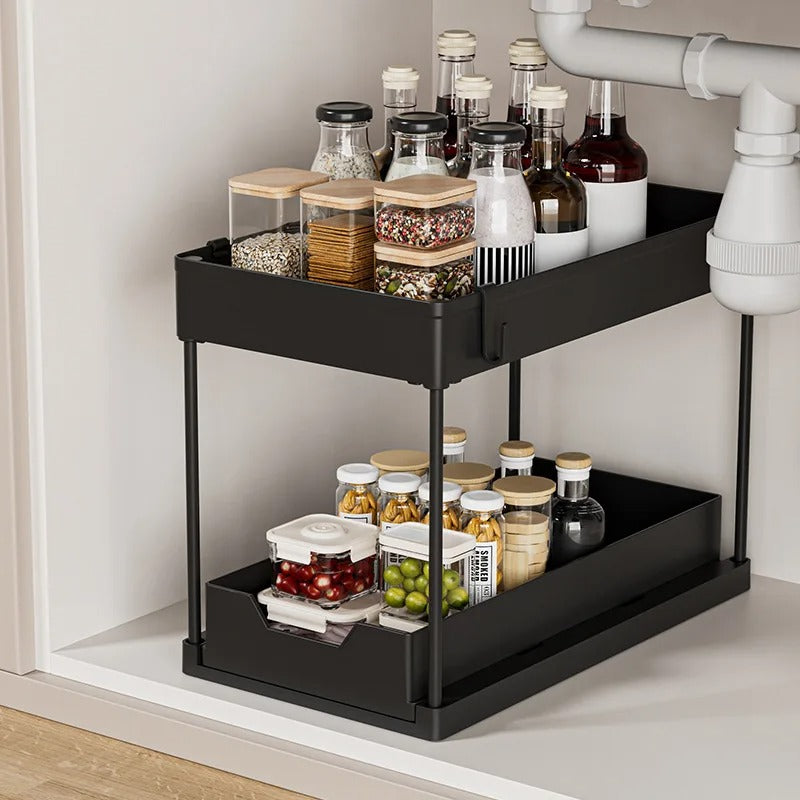 Notre étagère sous évier à 2 étages est conçue pour maximiser votre espace de rangement tout en gardant vos affaires bien organisées.